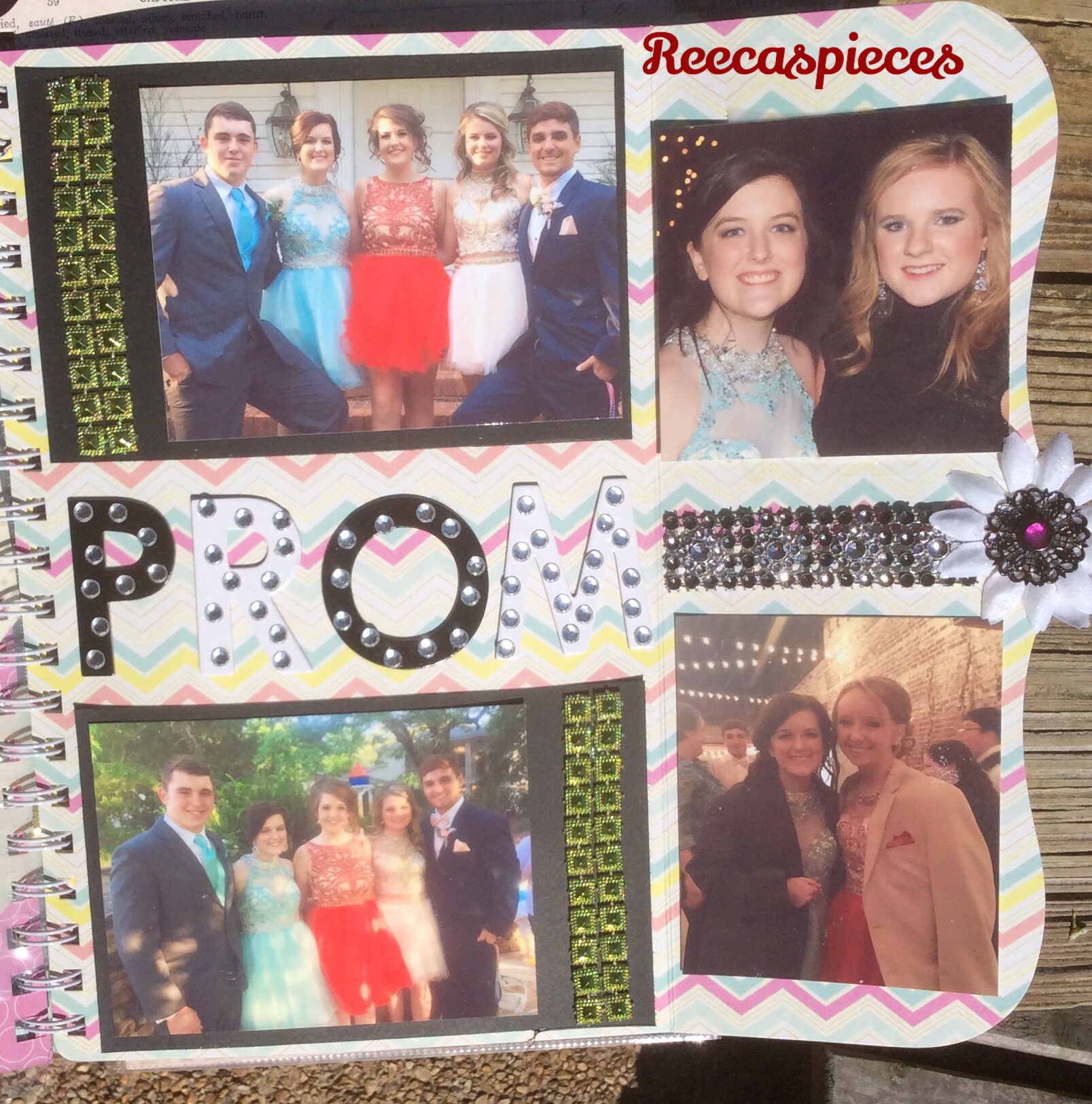 Mr C. and my daughter had a fight of sorts over the wearing of her homecoming dress to direct in. Needless to say, she won that argument. In the top pic of this layout he is hoping she doesn’t fall off the prodium.