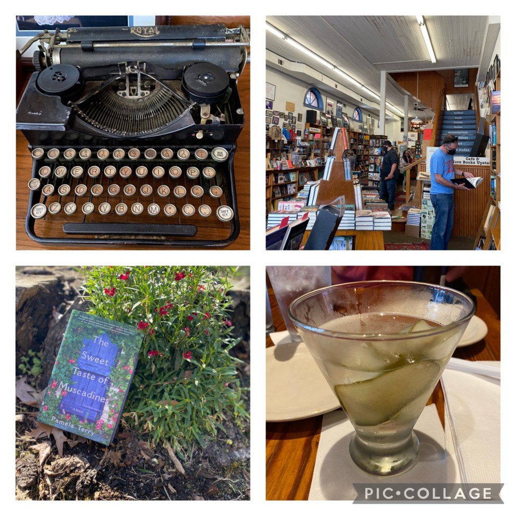 Well! March has been a fun month! I actually ate out a few times this month. And yes…those are pickles in that drink…pickle martini at its best! I also did a little junktiquing and came across a fantastic old typewriter. Plus a visit to my favorite book store on the planet..Square books in Oxford. I purchased a signed copy of The Sweet Taste of Muscadines.