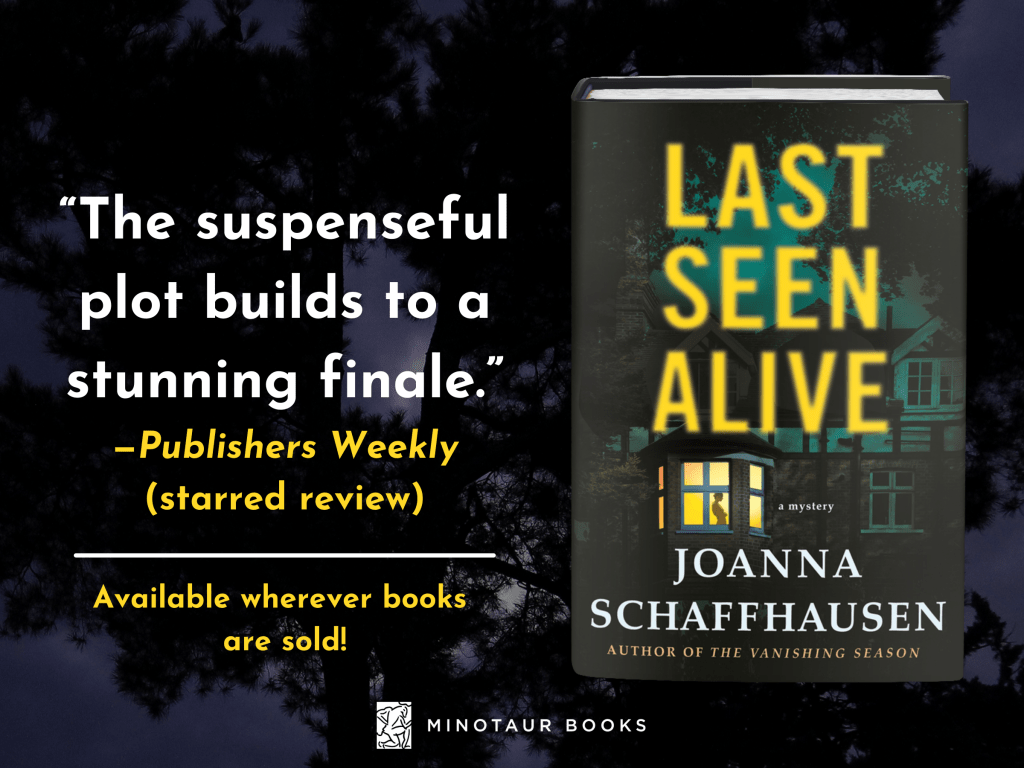 Last Seen Alive is the fifth book in Joanna Schaffhausen’s heartpounding Ellery Hathaway mystery series.